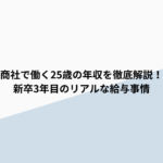 25歳商社員の年収について、より詳しい内訳や手当、福利厚生については商社で働く25歳の年収を徹底解説!新卒3年目のリアルな給与事情で詳しく解説しています。