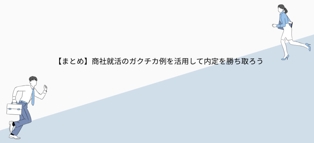 ここまで、商社の就活で評価されるガクチカの例と、その作り方、伝え方を詳しく解説してきました。